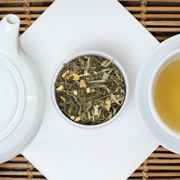 Thé vert sencha de Chine aromatisé au citron vert et gingembre. Fraîcheur et exotisme sont au rendez-vous.