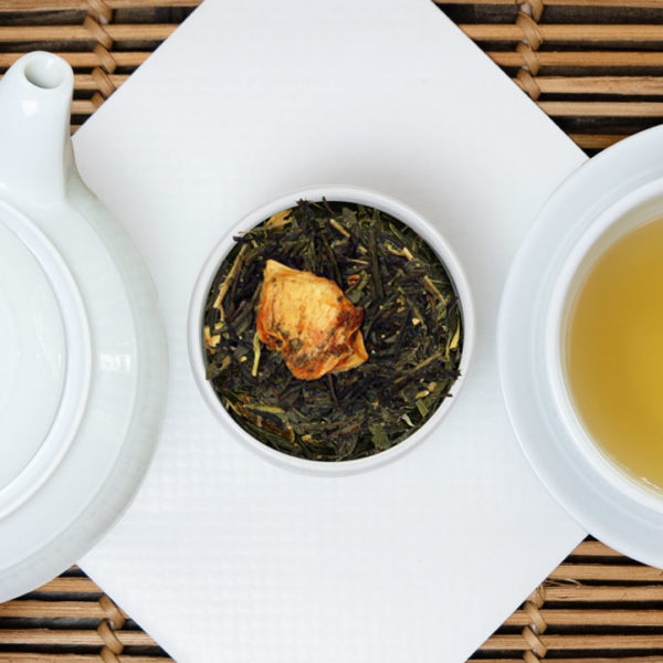 Thé vert sencha de chine aromatise a la mangue et a la papaye, parseme de morceaux de fruits