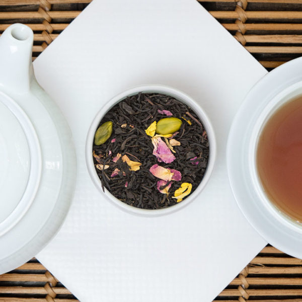 Thé noir de Chine aromatisé à la grenade, à la pistache et à l’abricot. Une escapade aux portes de l’Orient dans votre tasse de thé.